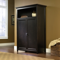 - Space-saving cabinet conceals monitor, printer, CPU, speakers, and more behind framed door panels